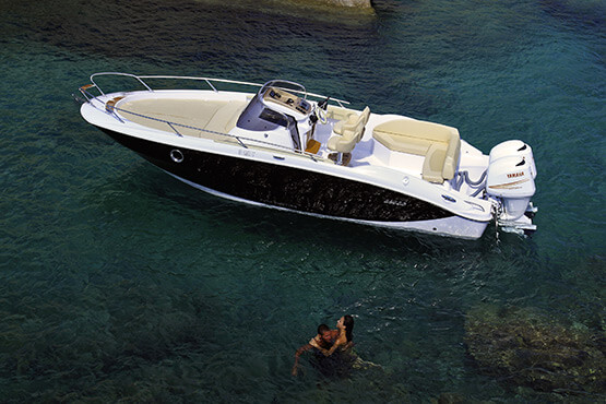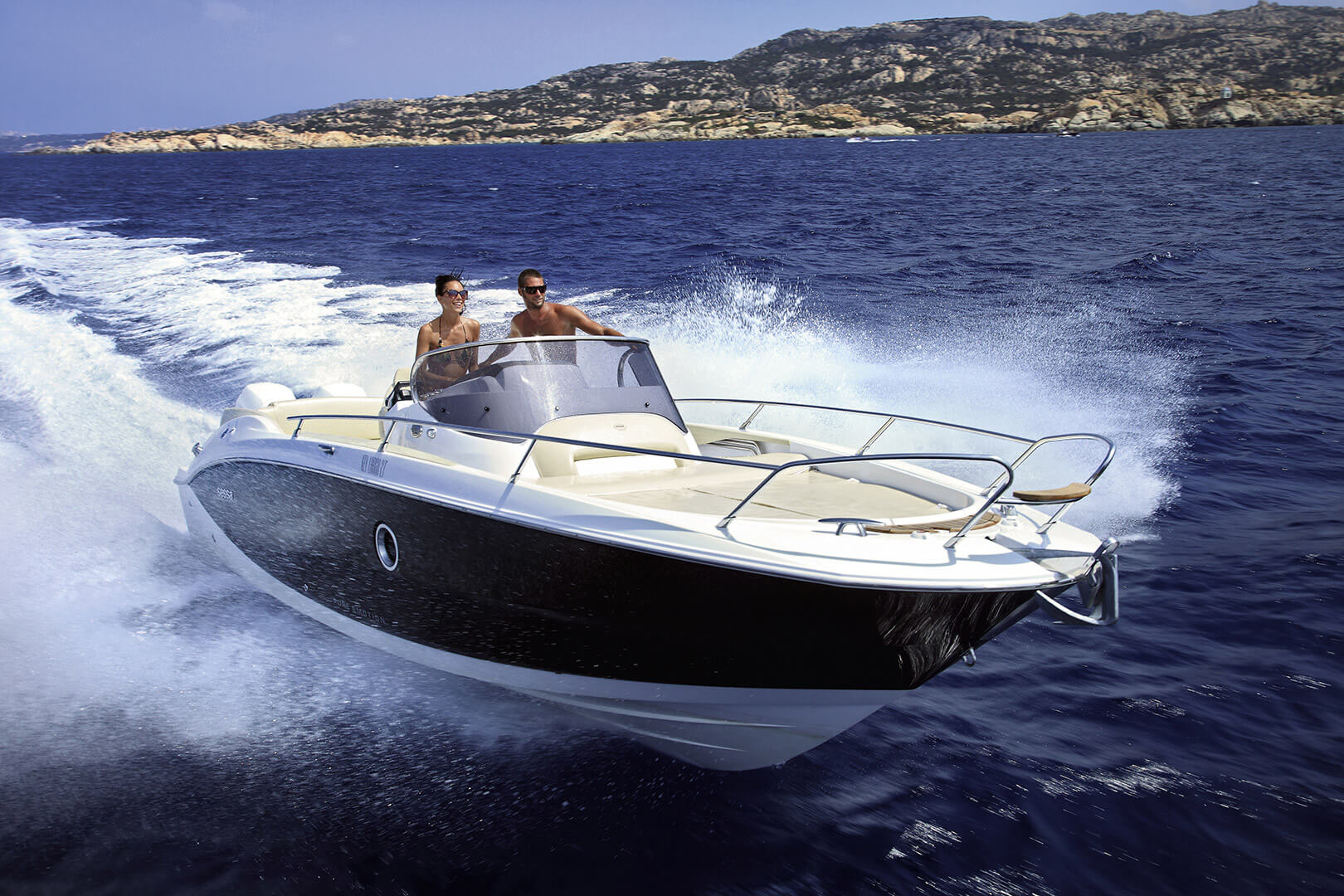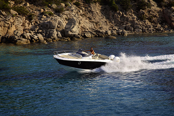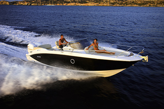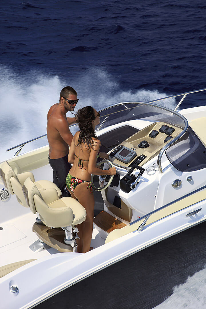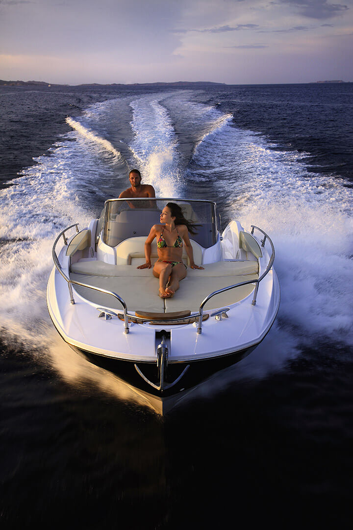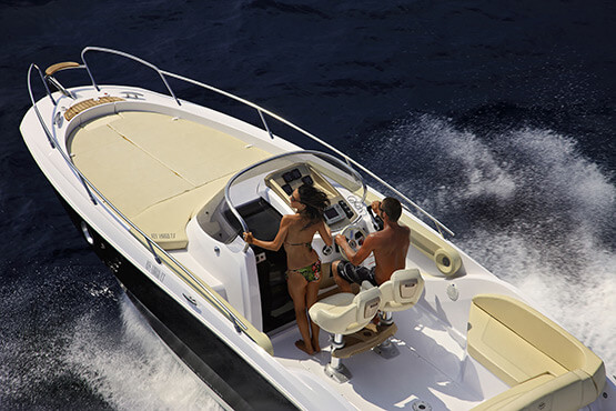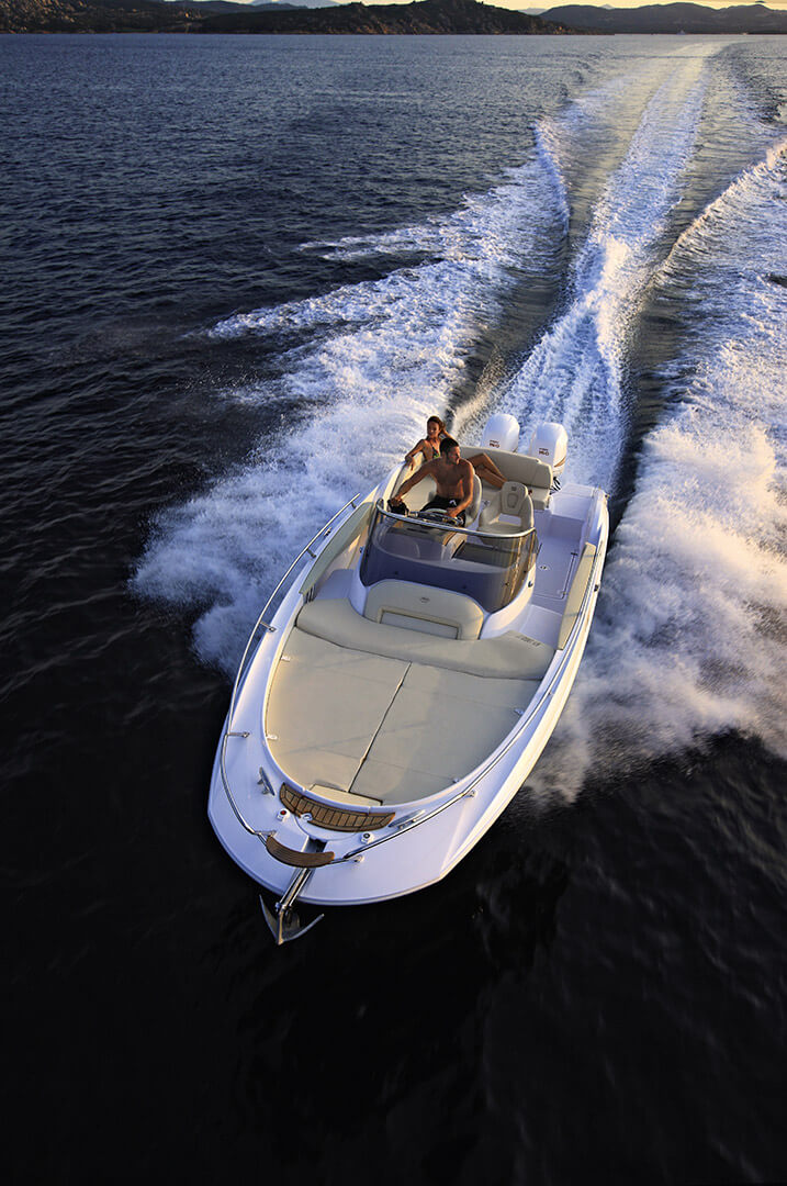 The very image of youth, while at the same time elegant and refined, for the new KL 27, this open 8m model that bends all the rules of the game. Its square nose and curvaceous fins evoke the elegance of a shark. Comfort and relaxation characterize the cockpit thanks to a large L-shaped sofa transformable into a sun bath on the stern and to the counter space with kitchen sink, hotplates and refrigerator, all found under the pilot seats. Below deck there is a single imperative: maximum functionality. A separate bathroom with WC and sink make this boat unique in its category.