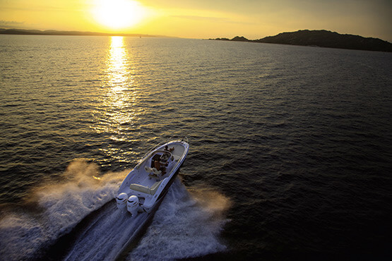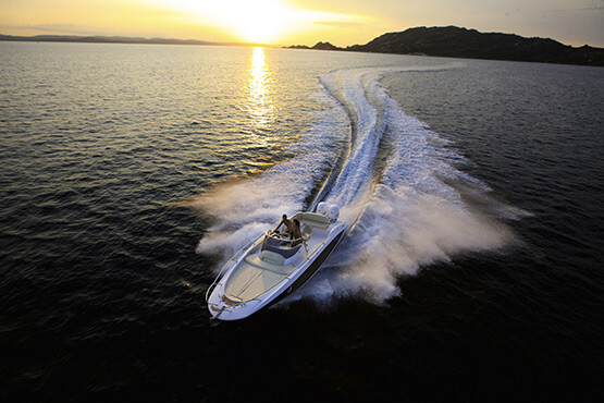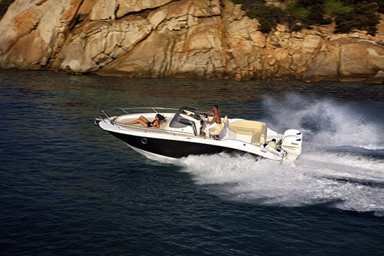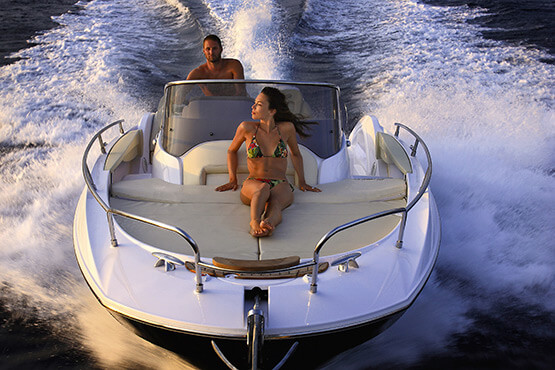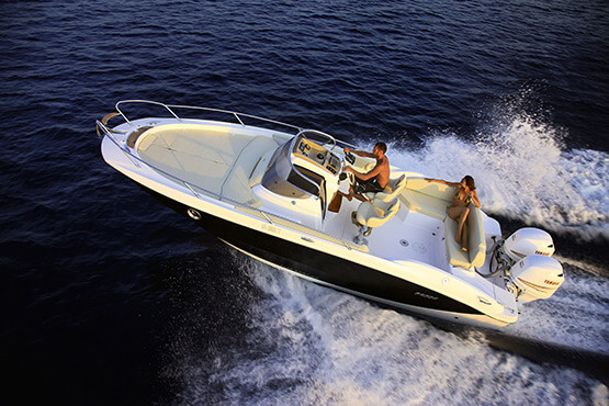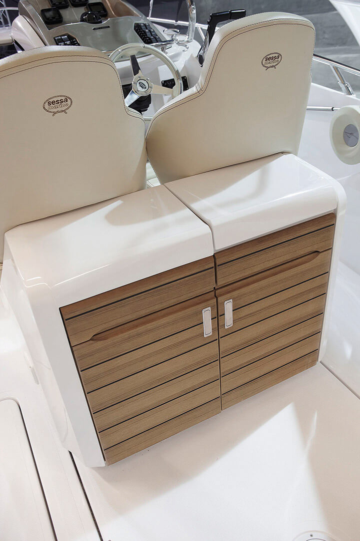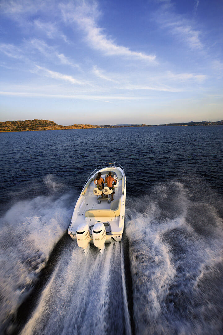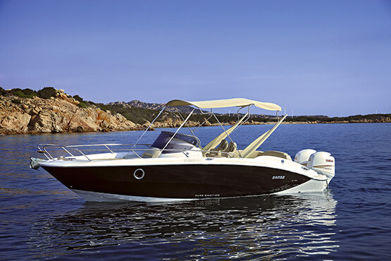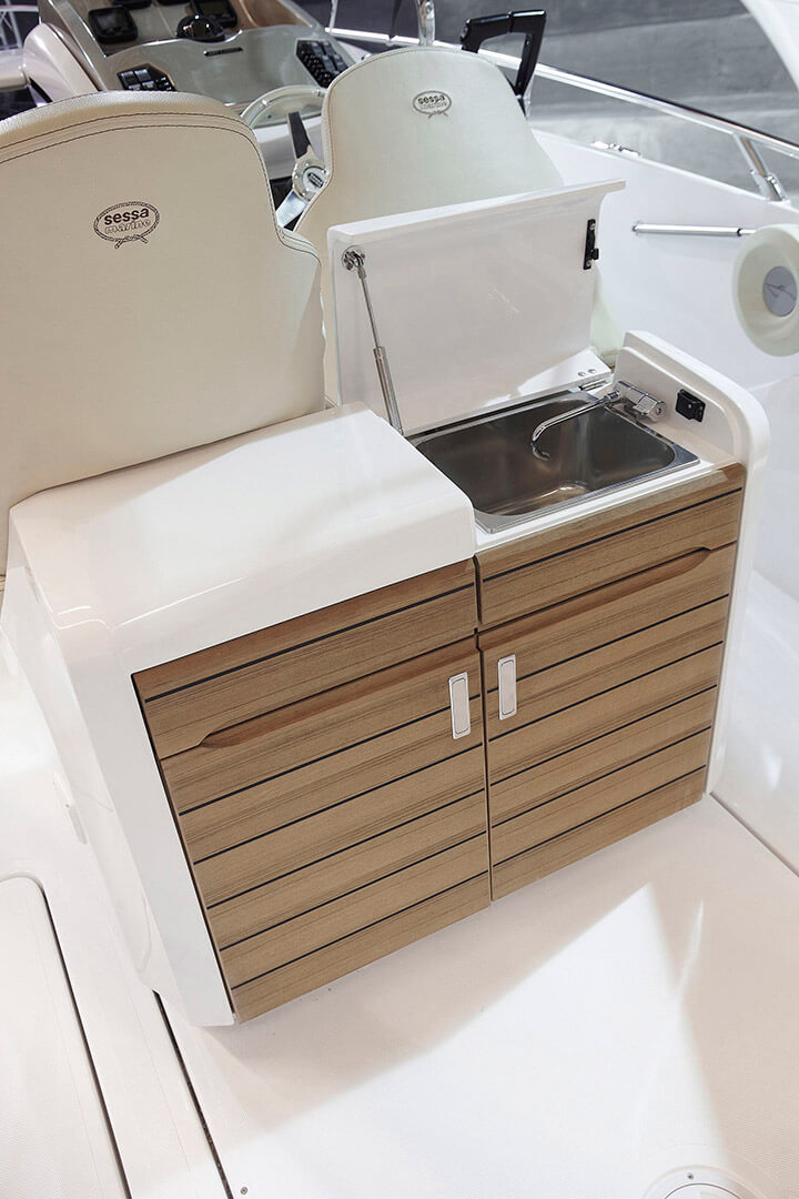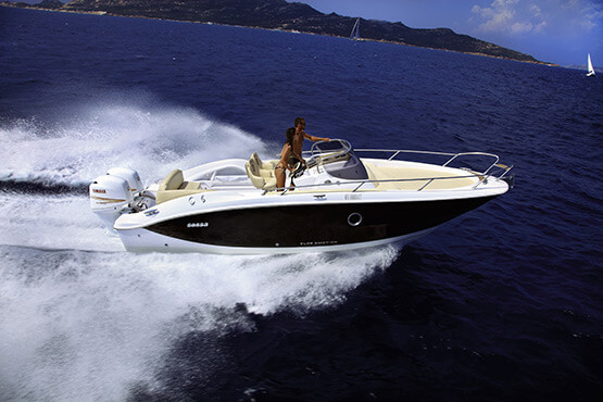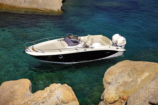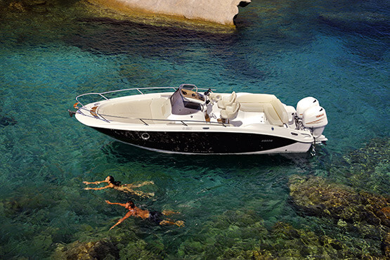 The very image of youth, while at the same time elegant and refined, for the new KL 27, this open 8m model that bends all the rules of the game. Its square nose and curvaceous fins evoke the elegance of a shark. Comfort and relaxation characterize the cockpit thanks to a large L-shaped sofa transformable into a sun bath on the stern and to the counter space with kitchen sink, hotplates and refrigerator, all found under the pilot seats. Below deck there is a single imperative: maximum functionality. A separate bathroom with WC and sink make this boat unique in its category.