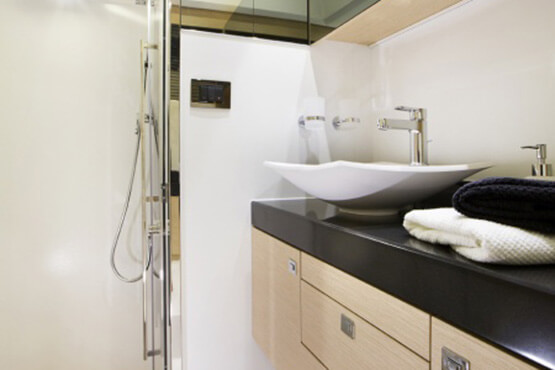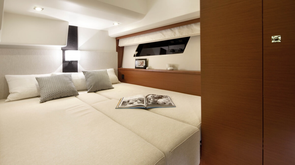 A proa, el espacio para relajarse se convierte en una verdadera terraza… cockpit abierto, salón interior, puesto de gobierno confortable y cabinas con grandes volumenes, todo ha sido realizado para reunirse los que lo deseen y permitir a otros de aislarse cómodamente.