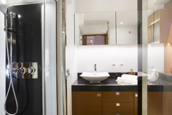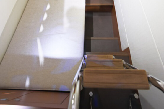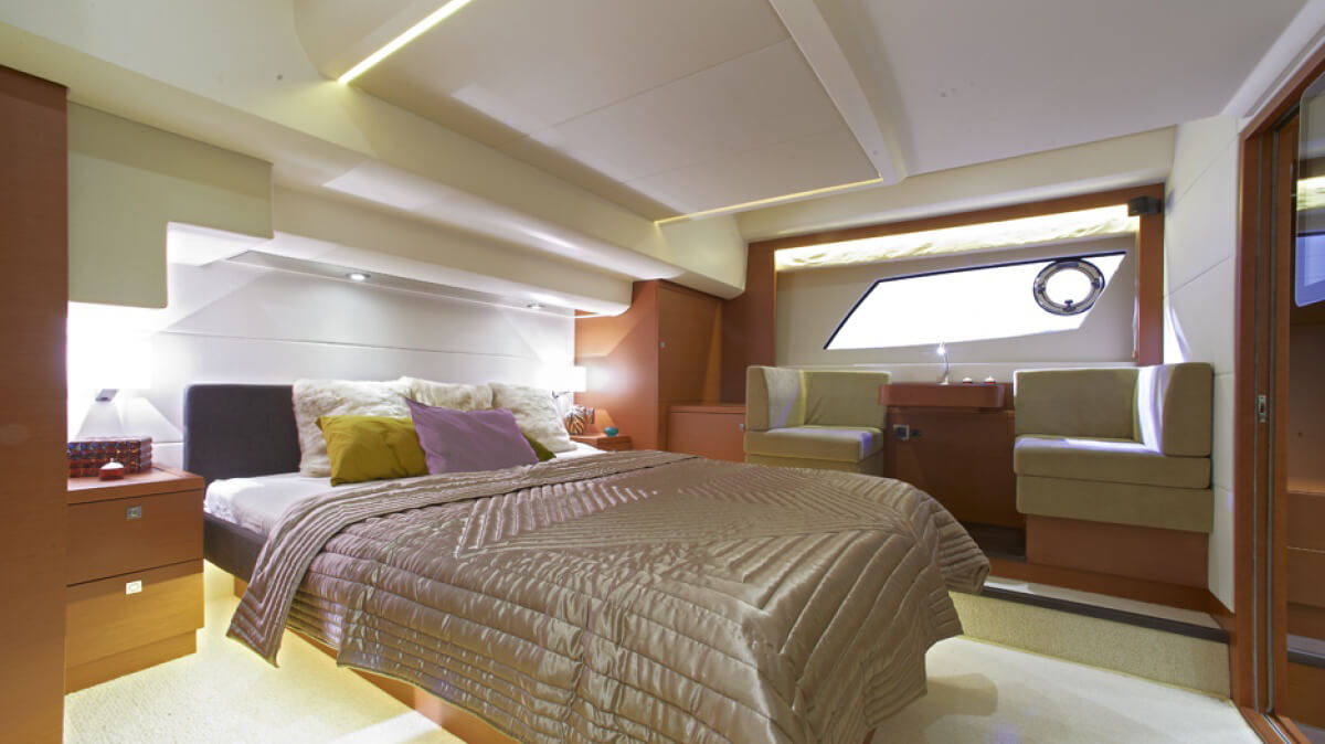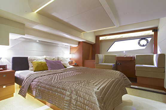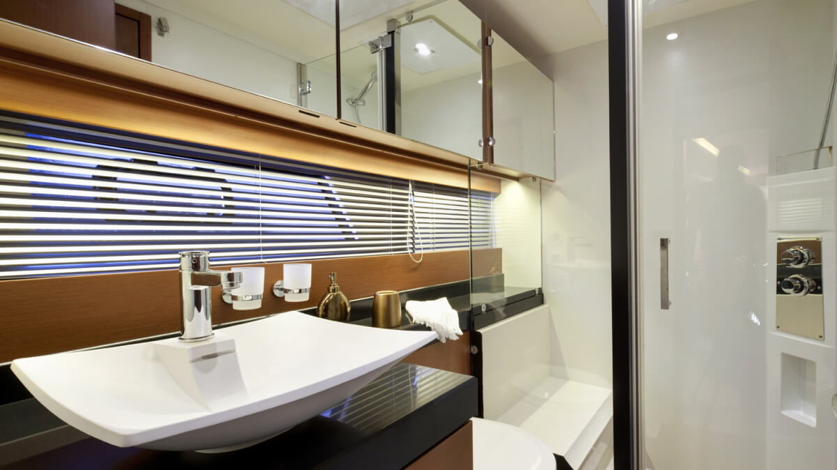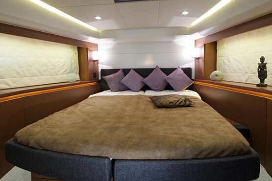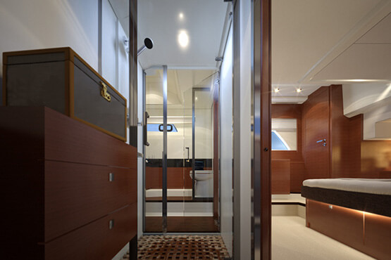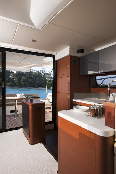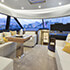El concepto elegante y con clase confiere a este fly bridge, una línea aun más depurada y una identidad más fuerte. Por su modernidad, el interior innova en materia de concepción de los espacios, el confort y el lujo.
