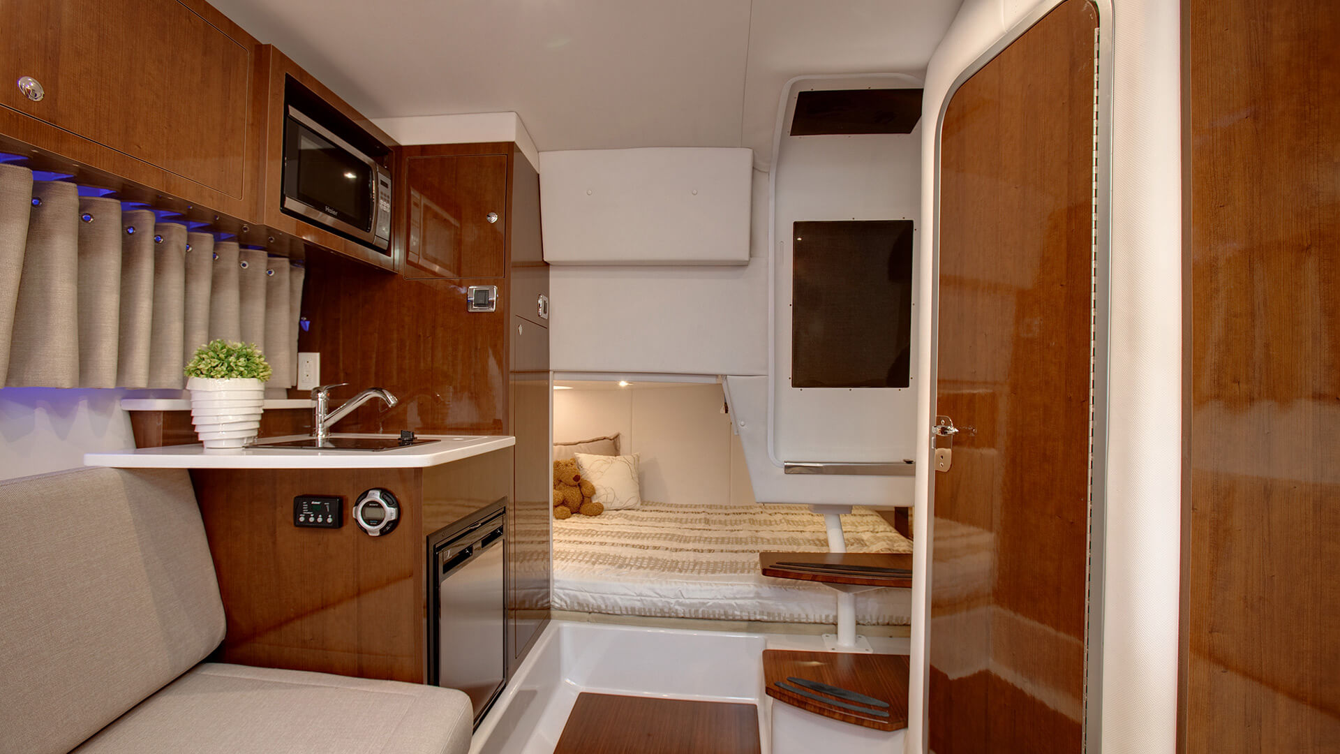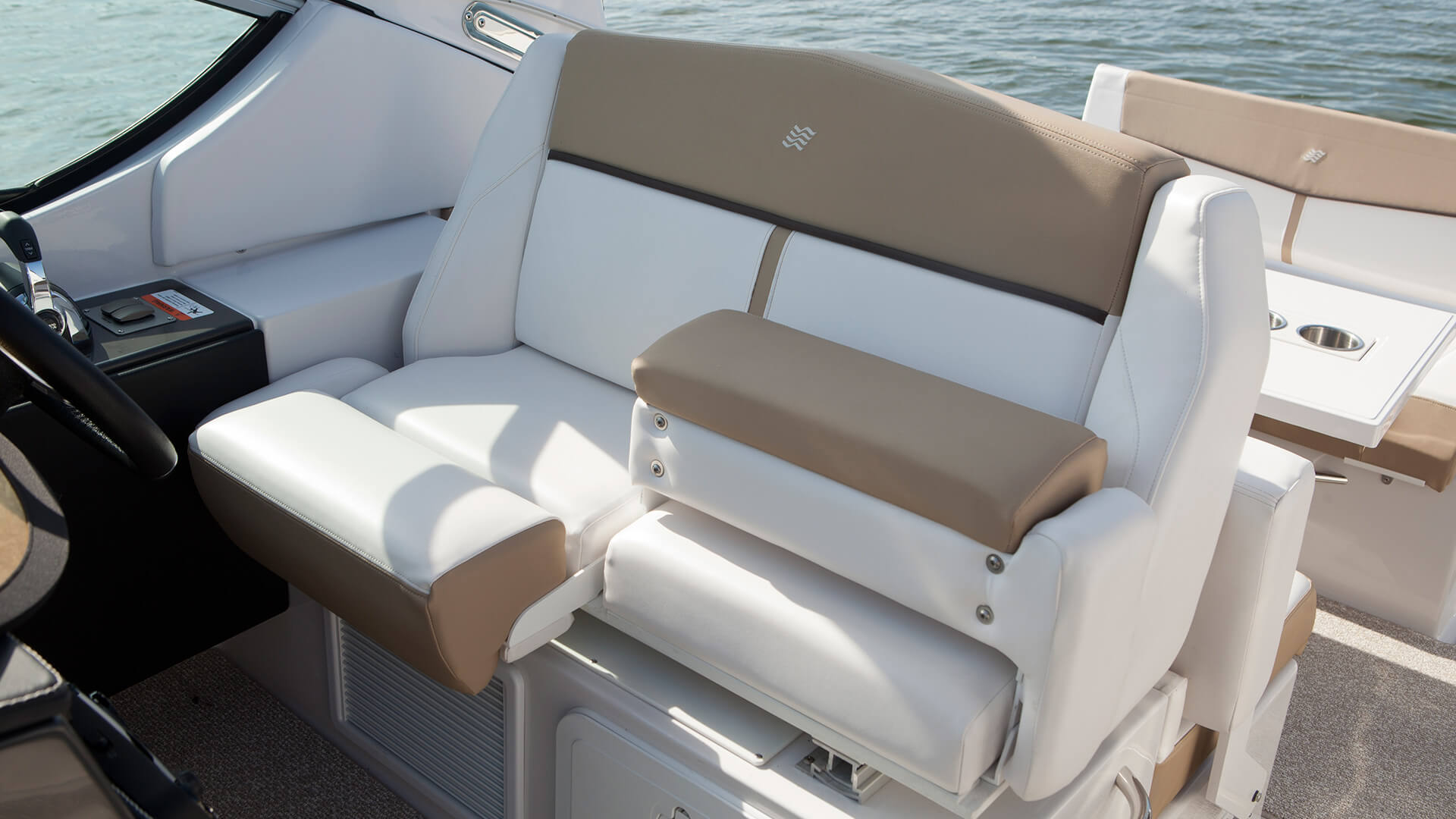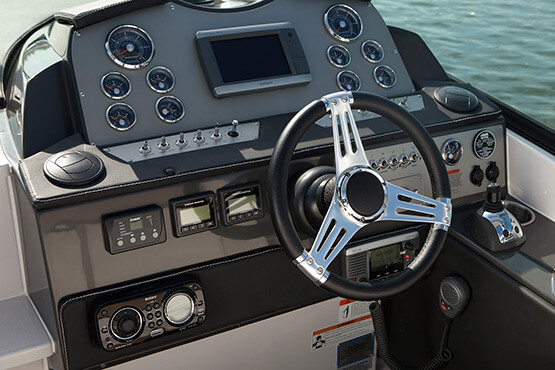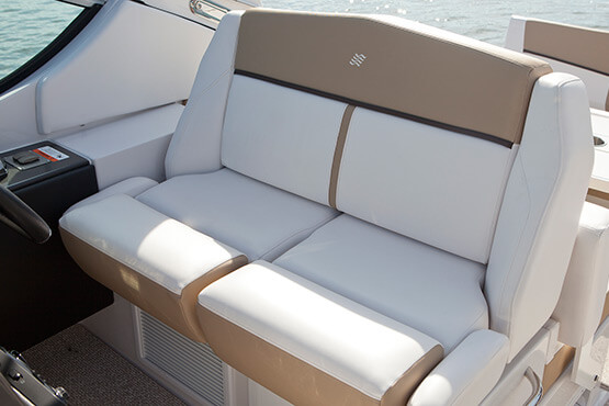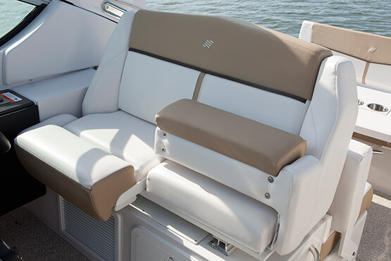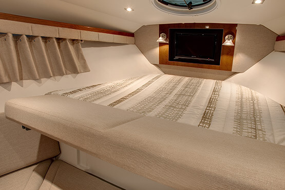 With sleeping quarters for six, two galleys, and all the accoutrements for gracious entertainment sur la mer, the 30-foot Vista 305 express cruiser is destined to be a true memory maker. Options to consider: private stateroom (aft), built-in grill and cockpit AC/heating.