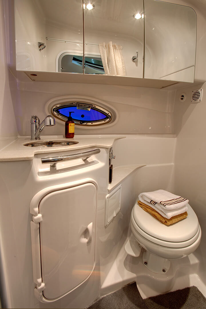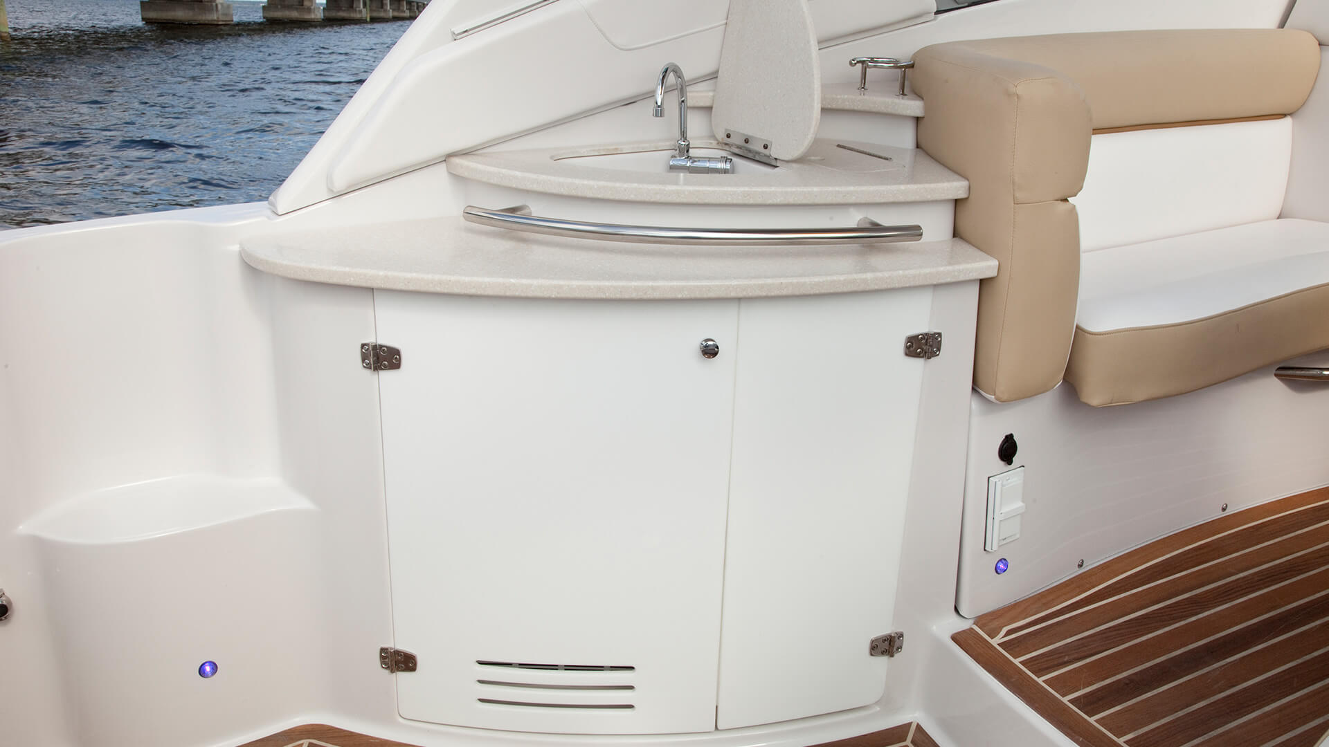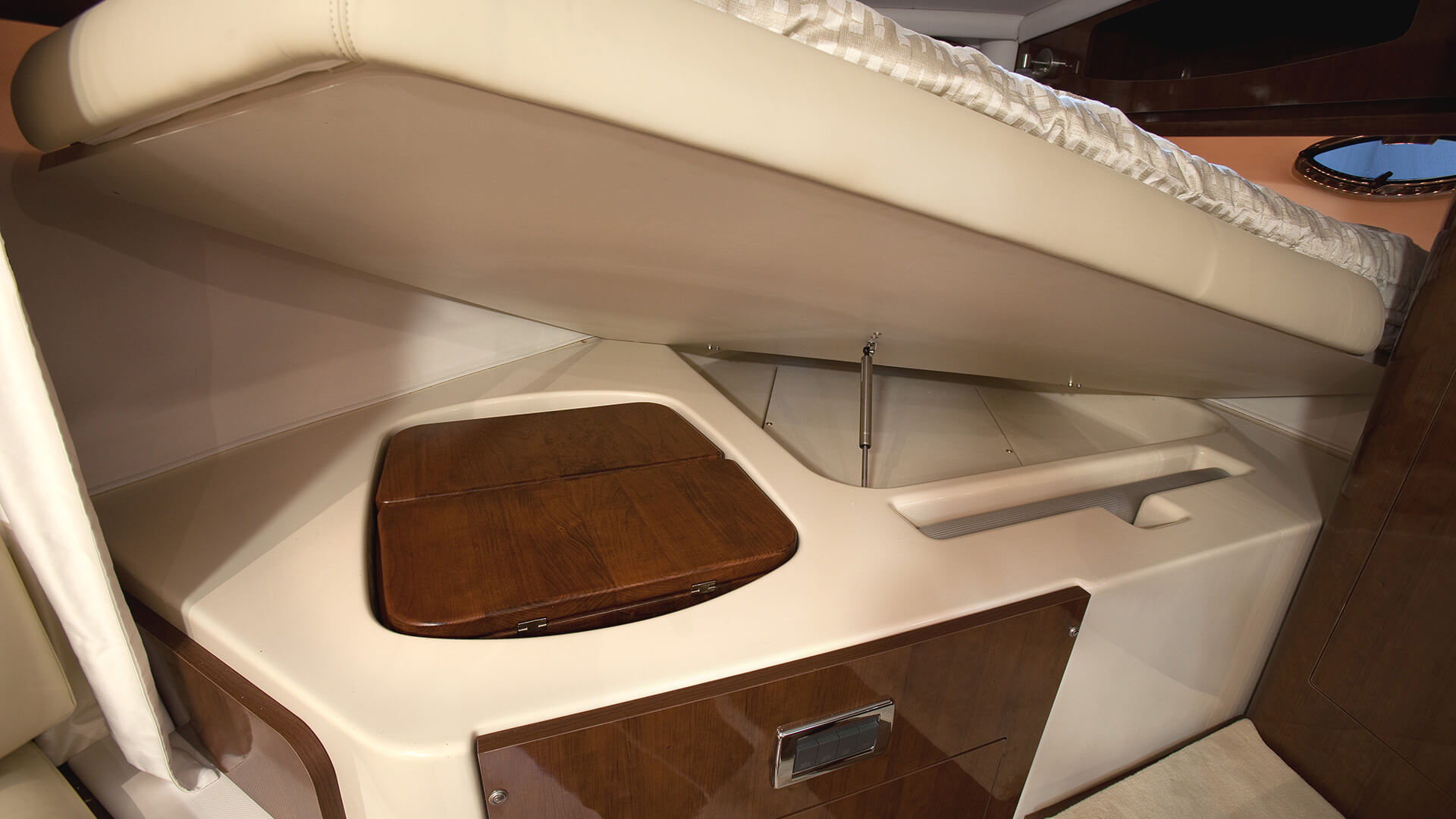 You'll be captivated by the Vista 335 cruiser. It's a 33-foot vision of understated elegance, from the smartly-designed cabin accommodations flanked by rich wood cabinetry to the well-appointed galley. Consider an optional private stateroom with flat-screen TV.